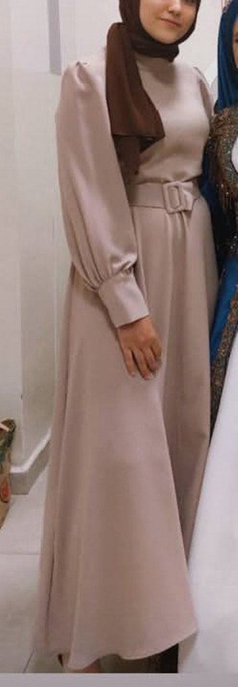 kemerli Bej renkte, drapeli, uzun kollu ve yakası kesik detaylı salaş kadın elbise. 1.75 boyum ön ayak bileğine geliyor arka daha uzun etek a kesim şeklinde rahat krep kumaş