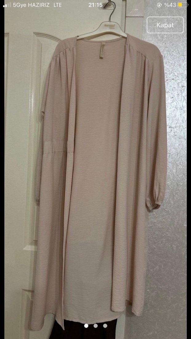 Bej renginde, uzun kollu ve salaş kesime sahip kadın sabahlığı. Minimalist ve bohem tarzda, desensiz ve pastel tonlarda.