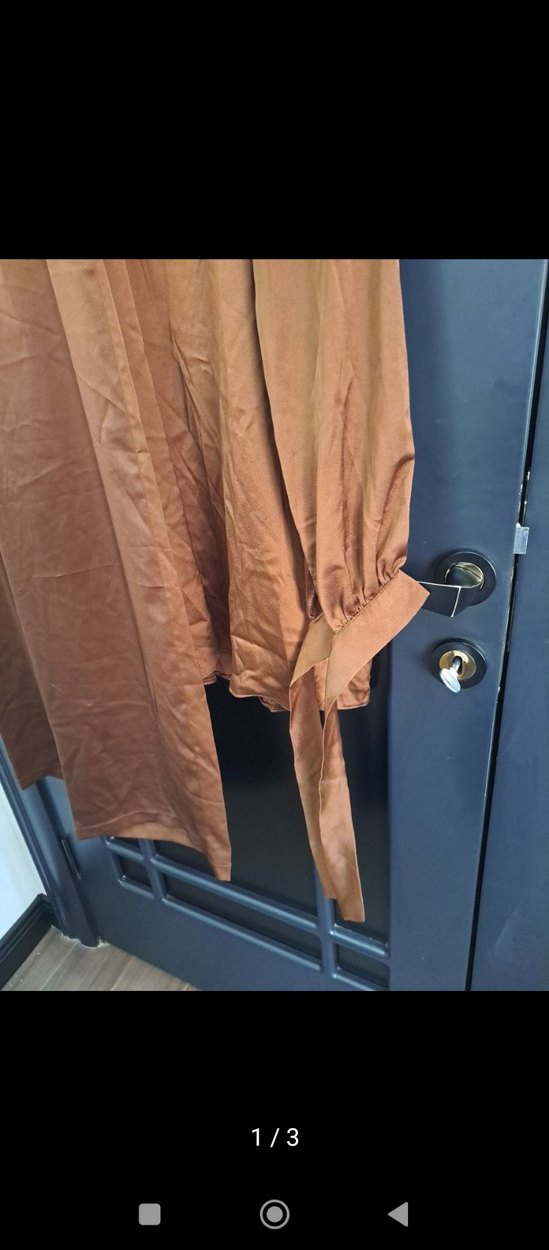 Bej renkli, uzun kollu ve salaş kesime sahip kadın sabahlığı. Parlak dokusu ve desensiz, minimalist tarzıyla öne çıkar.