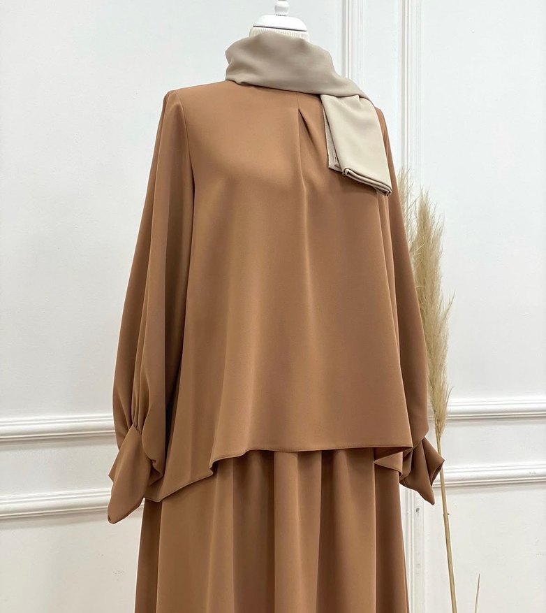 Camel renkte, uzun kollu ve salaş kesimli kadın takım Drapeli tasarımı, yuvarlak yakası ve sentetik dokusu ile modern ve minimal bir görünüm sunar. ( 1/2 defa giyildi sıfır hiçbir hatası defosu yok Quqa markası ) 40/42 beden uyumlu