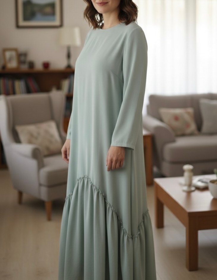 Bej renkte, keten kumaştan uzun kollu ve salaş kesim elbise. Etek kısmında fırfır detayı bulunur, sade ve mütevazı bir tarza sahiptir.