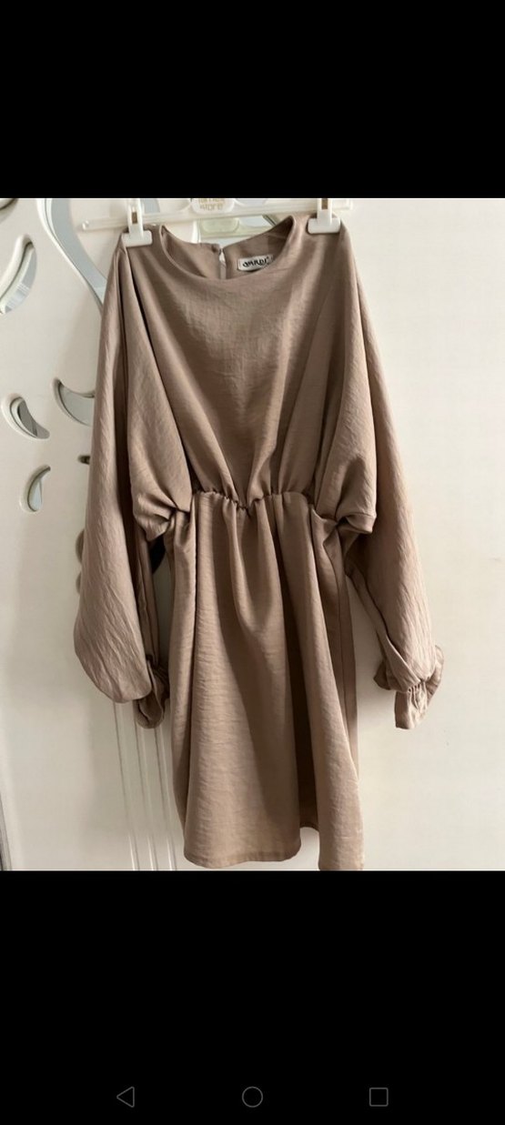 Bej renginde, uzun kollu, keten kumaştan salaş kesim elbise. Yüksek yakalı ve drapeli tasarımıyla rahat ve şık bir günlük kıyafet.