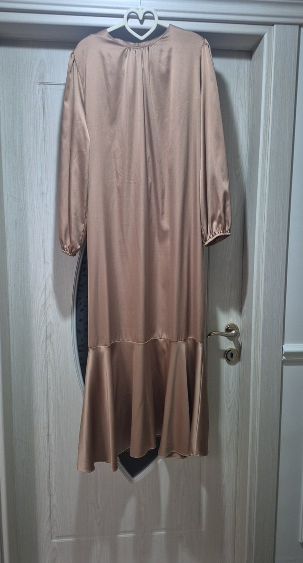 Bu uzun bej elbise, salaş kesimi, saten dokusu ve drapeli etek ucu ile dikkat çeker. Uzun kollu ve yuvarlak yakalı, sade ve mütevazı tarzda bir modeldir.✨