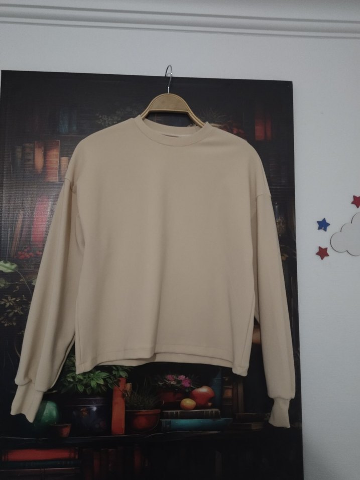 Bej renkli, yuvarlak yakalı ve uzun kollu bu sweatshirt, salaş kesimi ve yumuşak, sıcak dokusuyla günlük rahat stil için uygundur. Hic giyilmesi Özel dikimdir