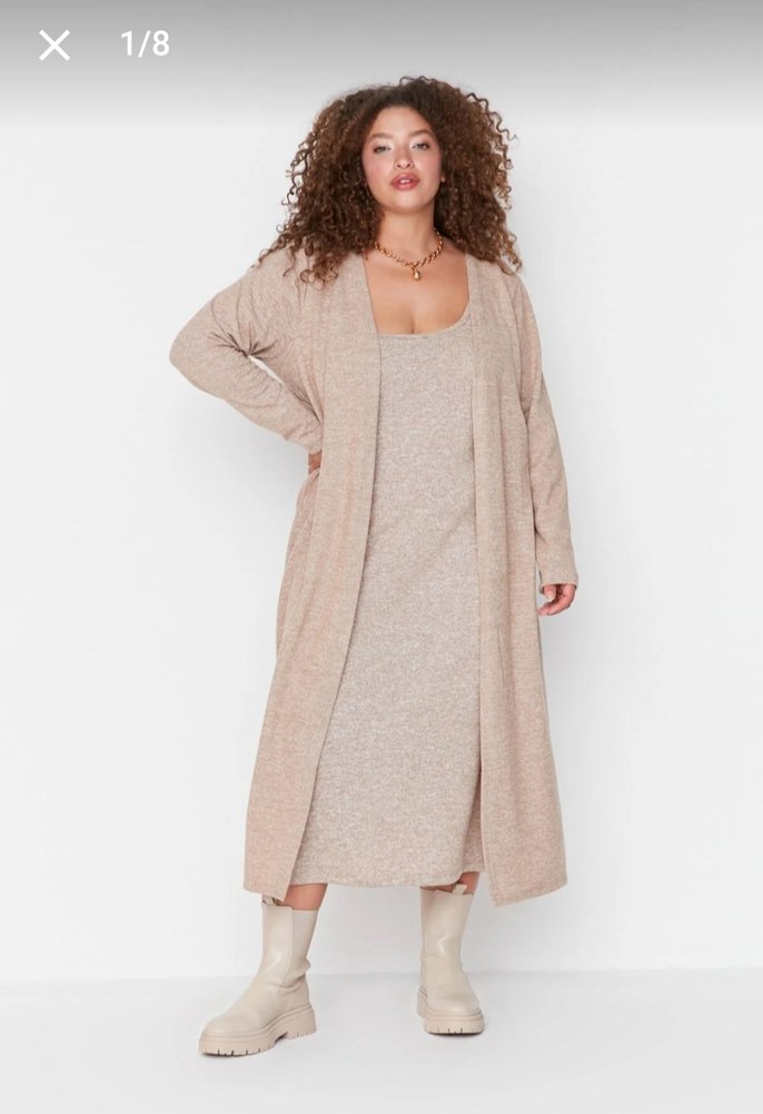 Bej renkte, yumuşak yün kumaştan uzun kollu, salaş kesim ve kayık yaka triko elbisedir. Rahat ve gündelik kullanıma uygundur, zahmetsiz şıklık sunar. Hamileler için çok uygundur.