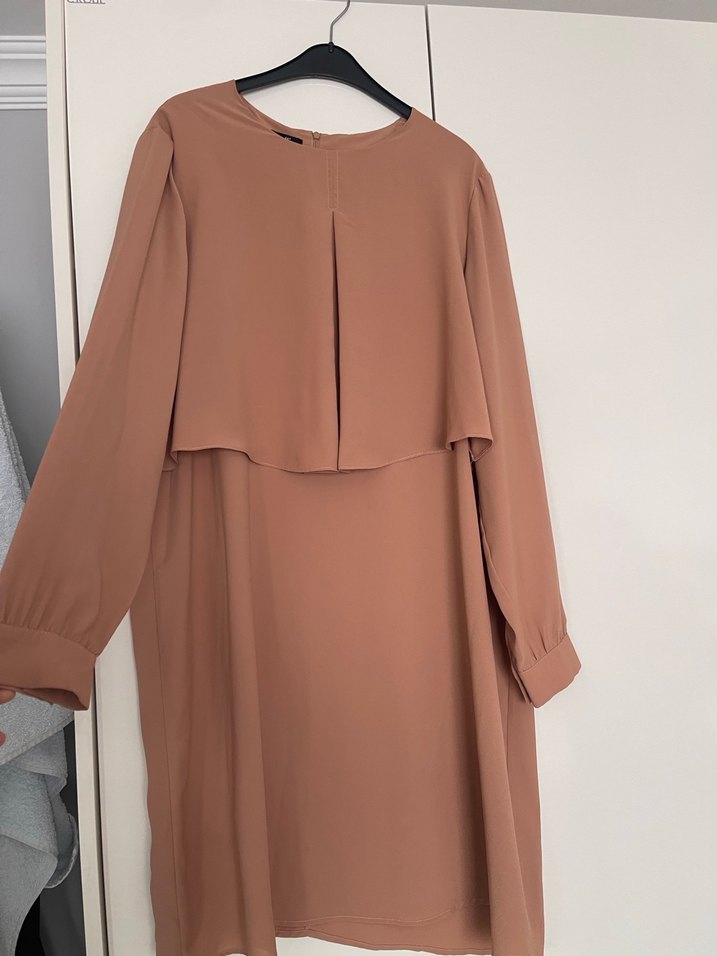 Bej renkli, salaş kesim ve drapeli tasarıma sahip uzun kollu tunik. İpek gibi yumuşak kumaştan, yuvarlak yaka ve minimalist ofis stilinde.