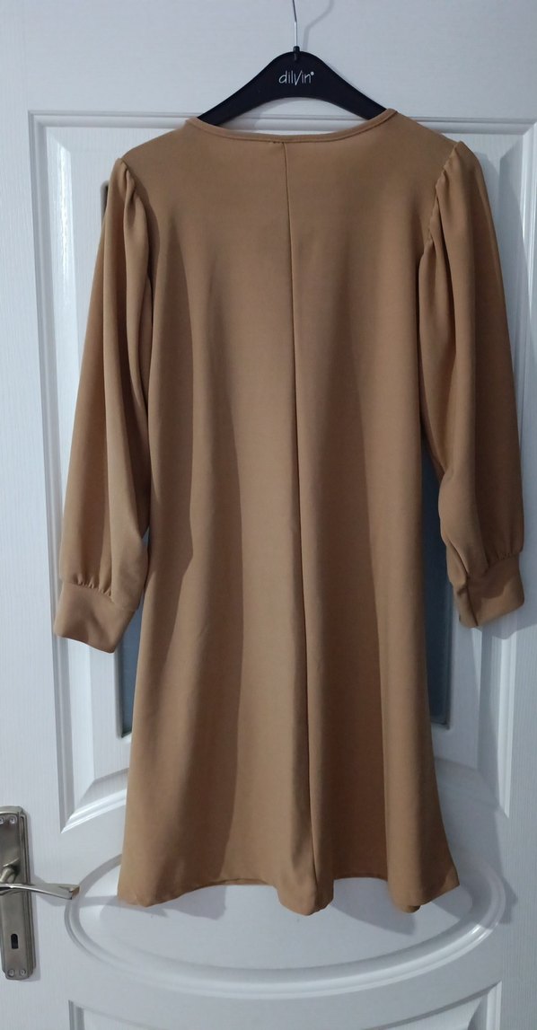 Bej renginde, uzun kollu, salaş kesim ve drapeli tasarıma sahip, yuvarlak yaka tunik. Ofis için uygun, sade ve modern görünümlü sentetik kumaş. uzunluğu 99 cm iki kolaltı arası 51 cm tofis dan almıştım