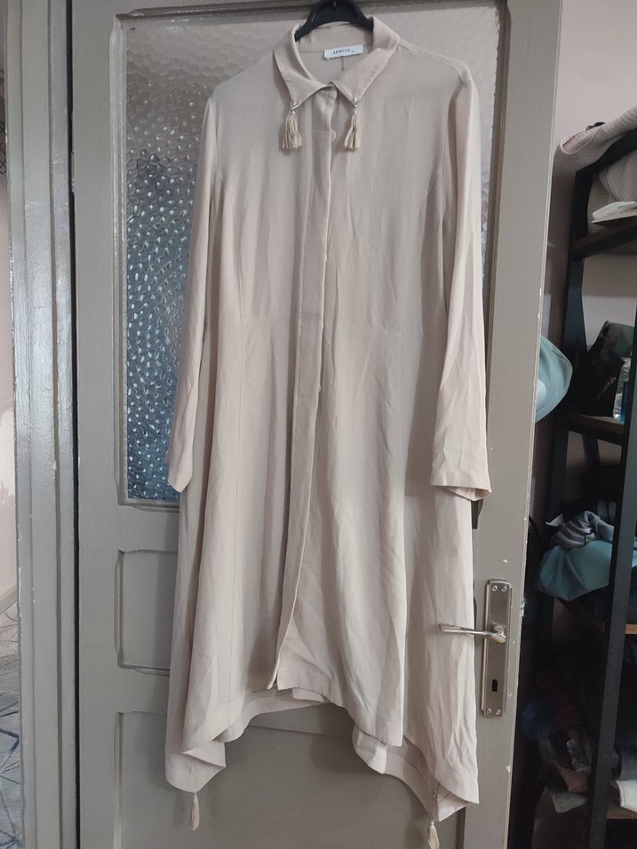 Uzun, bej renkli, salaş kesim ve drapeli tasarıma sahip, yakalı uzun kollu tunik. Yumuşak sentetik kumaştan, günlük kullanıma uygun bohem Paris tarzı.