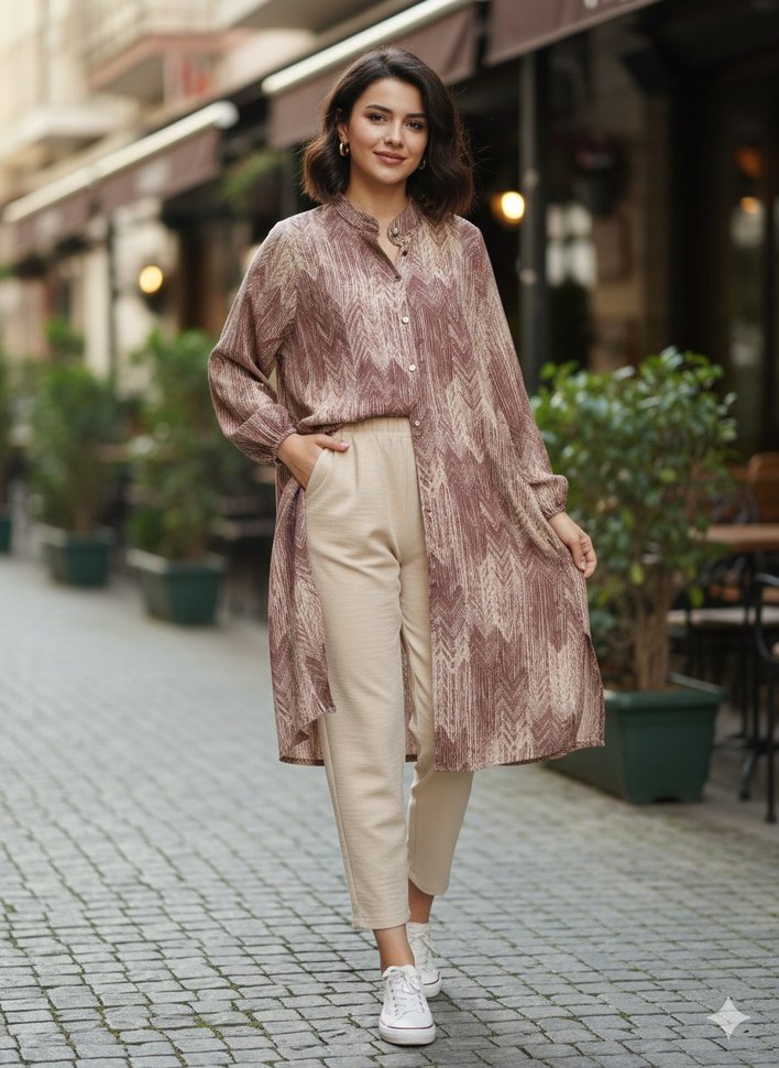 Kadınlar için bej renkli, uzun kollu, salaş kesim ve dökümlü tunik. V yaka ve hafif batik desenli, ipeksi dokuda, günlük rahat stil için uygundur.