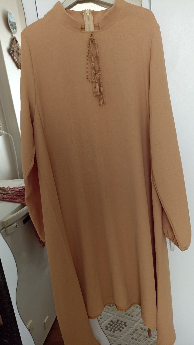 Uzun kollu, salaş kesim bej tunik. Yuvarlak yaka ve püskül detayı bulunur. İpeksi kumaştan, minimalist bohem tarzda, mütevazı günlük kullanım için uygundur.