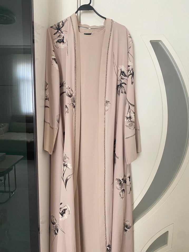 Ürün taşlı ve kendinden desenli ikili abaya takım bej renkli ipek kumaştan üretilmiştir çok çok güzel ve kaliteli bir üründür davetlerde tercih edilir şalı ve kemeride mevcuttur o kadar güzel ki dökümlü ve deseni çok güzel telefonda belli değil ama canlı daha güzel duruyor