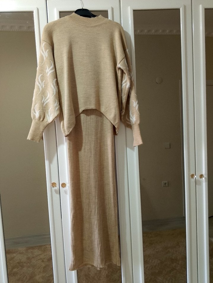 Bej renkte, uzun kollu ve bol kesim triko elbise. Yuvarlak yaka ve desensiz tasarımıyla rahat ve sade bir görünüm sunar. Günlük kullanıma uygun. elbise Kazak ikili