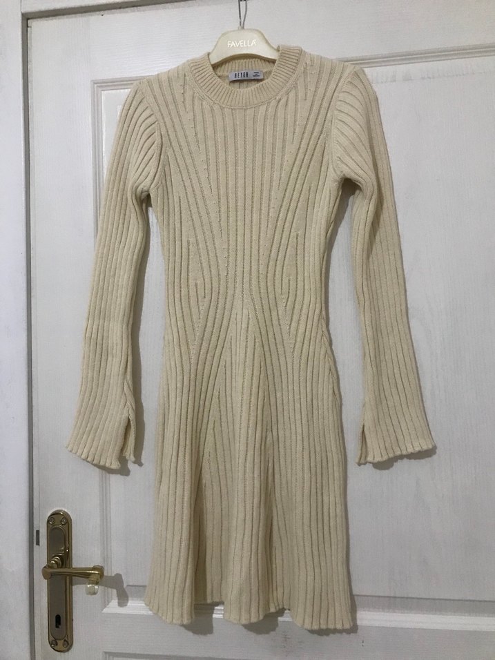 Bej Uzun Kollu Triko Elbise