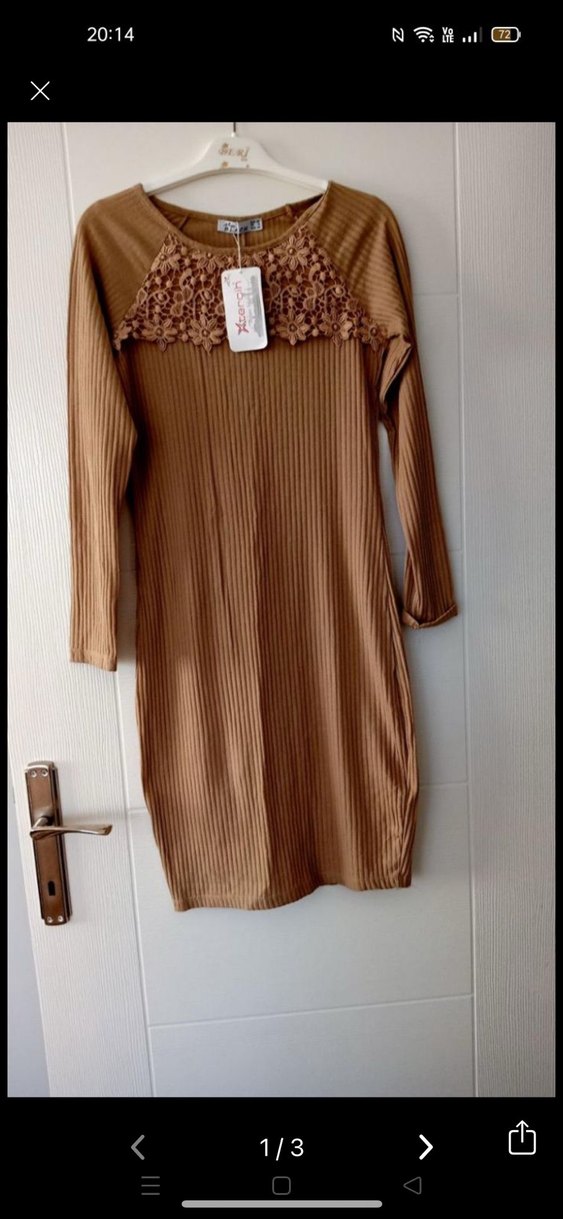 Uzun kollu ve bisiklet yakalı, yumuşak triko kumaştan yapılmış bej renkli, vücuda oturan triko elbise. Göğüs kısmında örme dantel detayı bulunur.