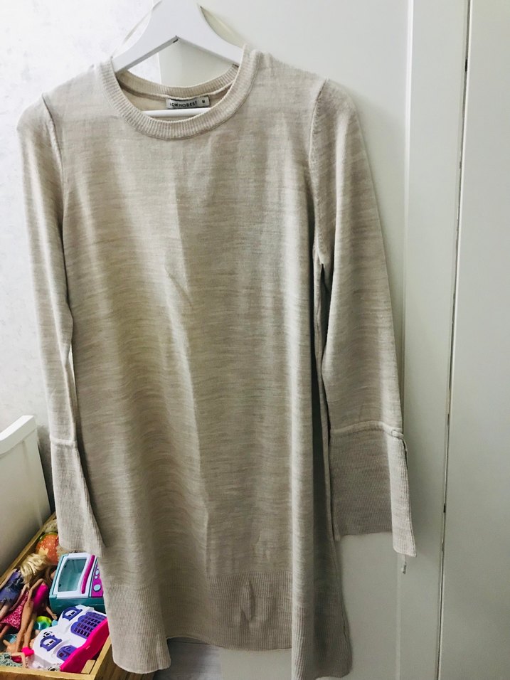 Bej renkte, uzun kollu ve triko kumaştan yapılmış, yuvarlak yakalı rahat ve bohem tarzda kazak elbise. Günlük kullanıma uygun.