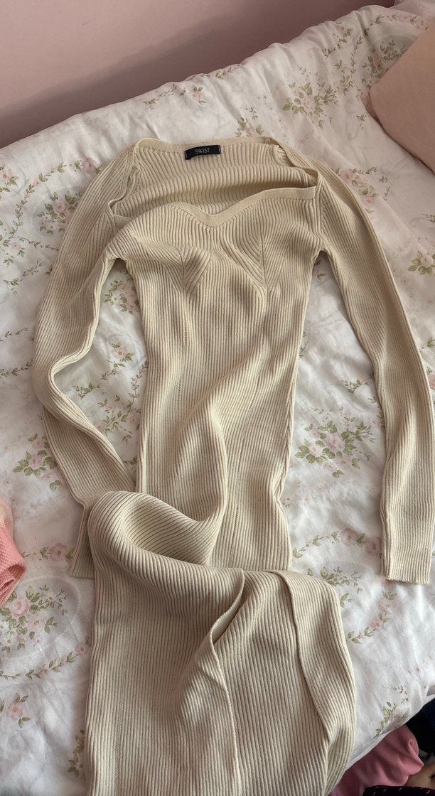 Bej renkli, V yakalı, uzun kollu, triko kumaştan yapılmış, vücuda oturan uzun elbisedir. Bohem tarzda, pastel tonlarda, günlük kullanıma uygundur.