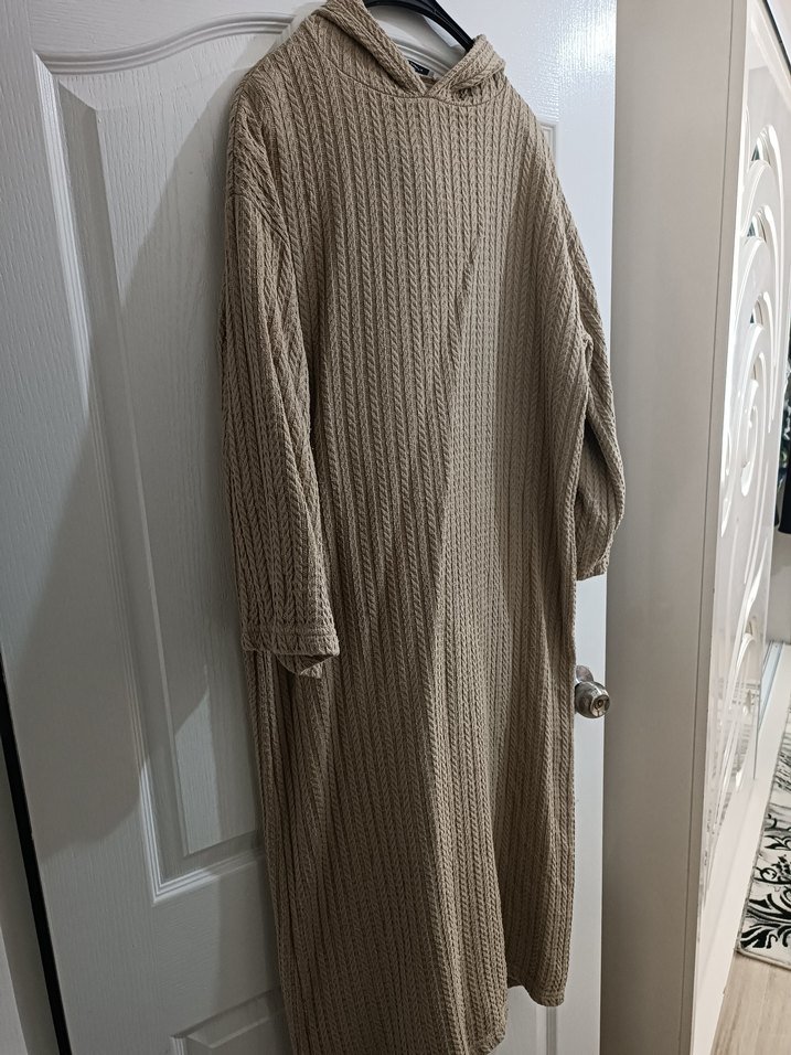 Bej renkli, yumuşak keten kumaştan örülmüş, uzun kollu ve bol kesim triko elbisedir. Yuvarlak yakalı ve uzun boyludur, günlük kullanıma uygundur. almak için buusra23 yazın