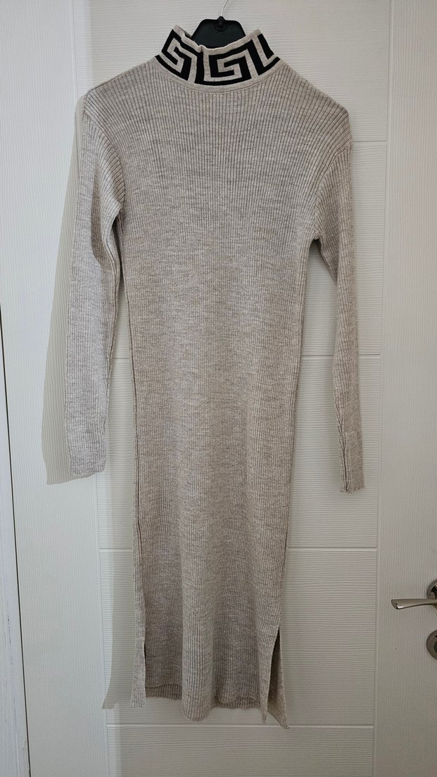 Bej renkte, uzun kollu ve triko örgüden yapılmış, vücuda oturan kesimli kadın elbisesi. Günlük kullanıma uygun, rahat ve sıcak tutar.