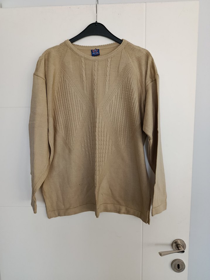 Bej renkli, pamuklu triko, uzun kollu ve yuvarlak yakalı kadın kazak. Rahat kesimi ve normal boyuyla günlük sokak stiline uygun. koltuk altı ölçüsü 67 cm boy 70 cm