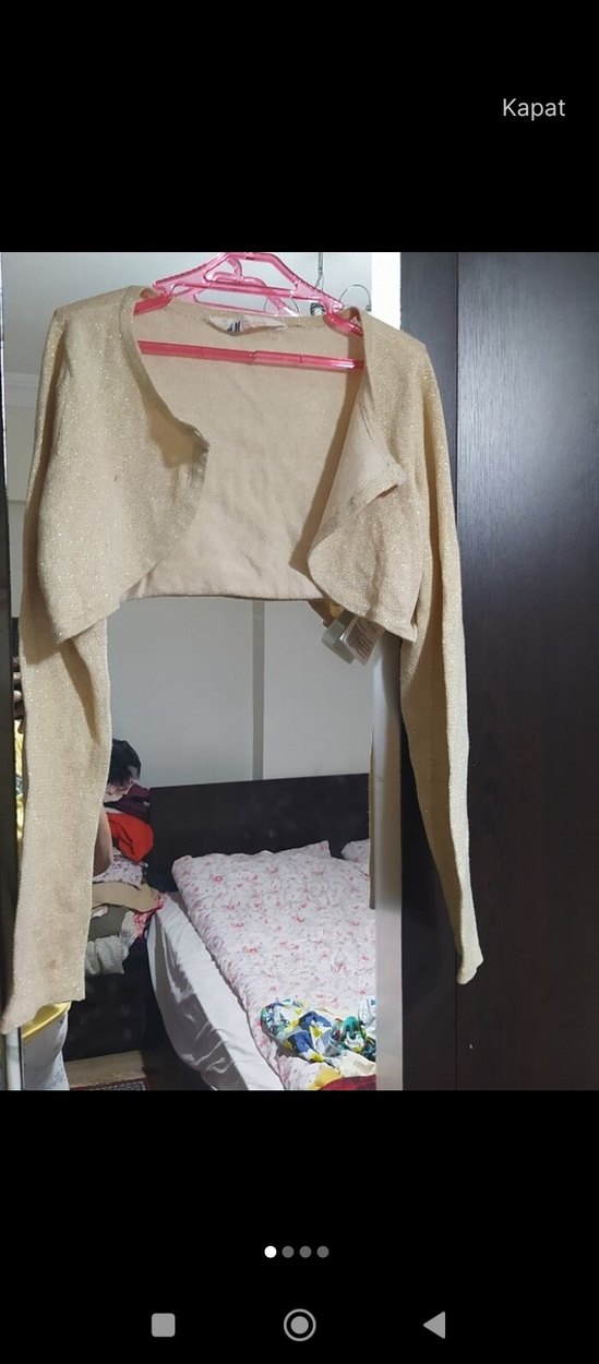 Bej renkli, uzun kollu, straplez yakalı, triko dokuma kiz çocuk bolero. İnce ve vücuda oturan kesimiyle günlük sokak stiline uygun.