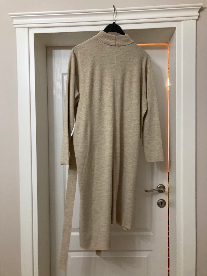 Bej renkli, yüksek yakalı ve uzun kollu triko elbise. Yumuşak keten kumaştan, bol kesim ve drapeli tasarıma sahip minimal, normcore stil. Günlük kullanıma uygun. Sorunsuz defosuz tertemiz yandan bağlamalı üst Bir kaç kez kullanılmış Yeni den farksız