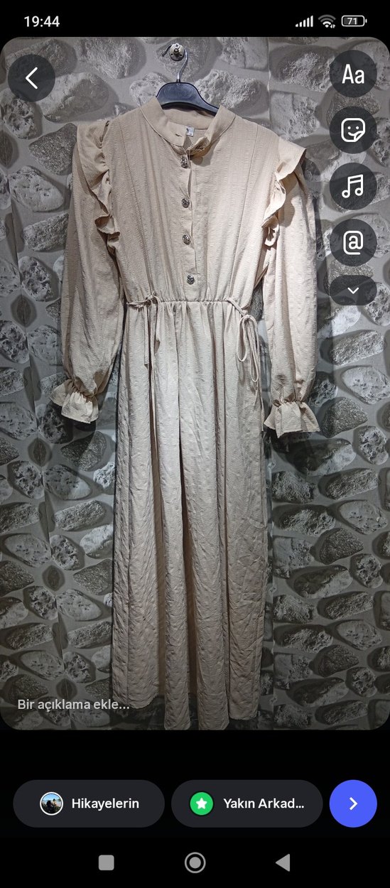 Bej renkli, kumaştan yapılmış, uzun kollu ve yüksek yakalı uzun elbise. Fırfır detayları ve bol kesimiyle vintage bohem tarzında, günlük kullanıma uygun.