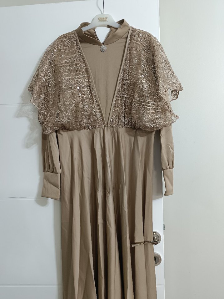 Bej tonlarında, V yakalı ve uzun kollu, drapeli, bol kesim kadın uzun abiye elbisedir. Vintage ve modern klasik tarzıyla düğünler için uygundur.