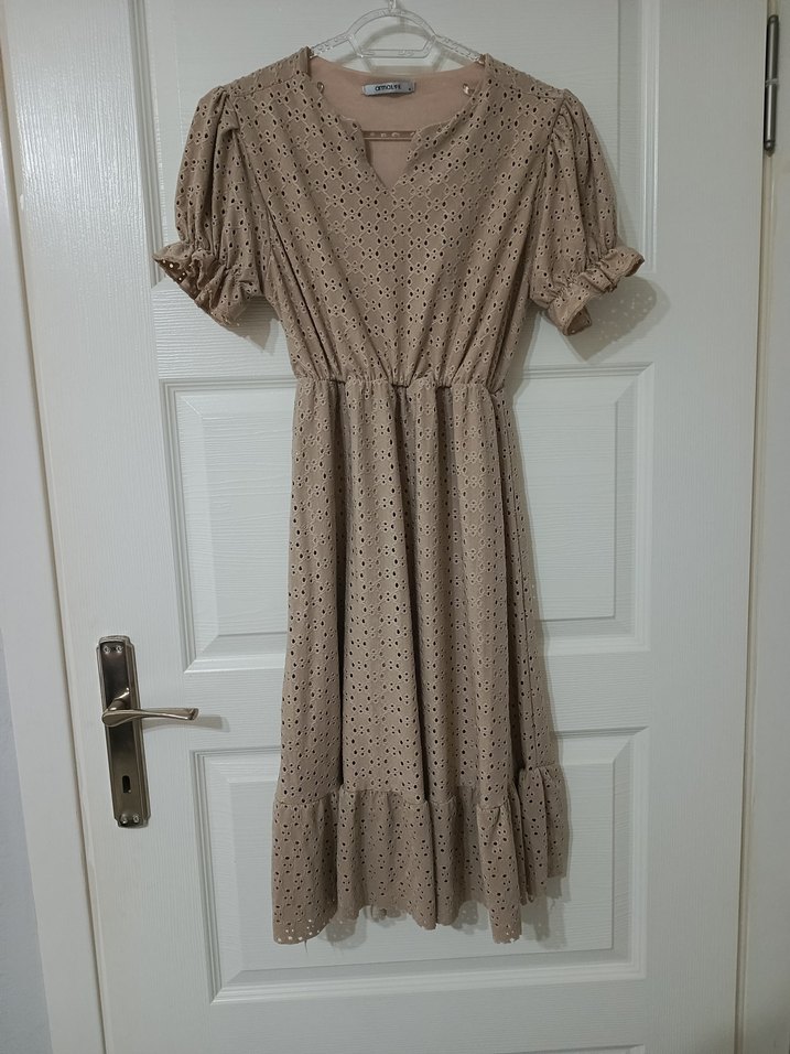 V yaka, kısa balon kollu, nakışlı detaylı ve uçlarında fırfır bulunan bol kesim uzun bej elbise. Yumuşak sentetik kumaştan, bohem tarzı yansıtıyor.