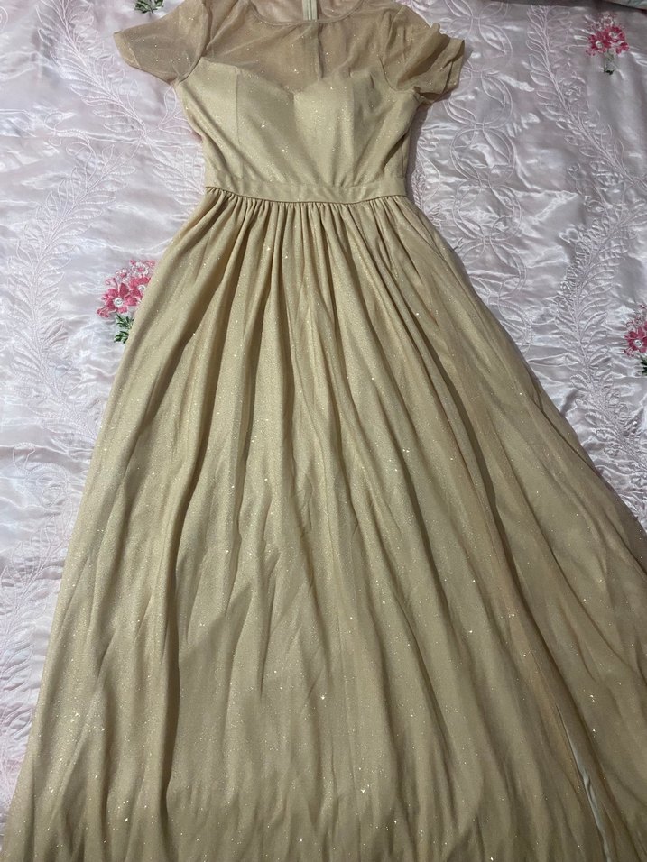 Bej renkte, V yakalı ve kısa kollu, uzun ve drapeli vintage tarzda bohem elbise. Pastel tonlarda, klasik ve zarif bir görünüm sunar.