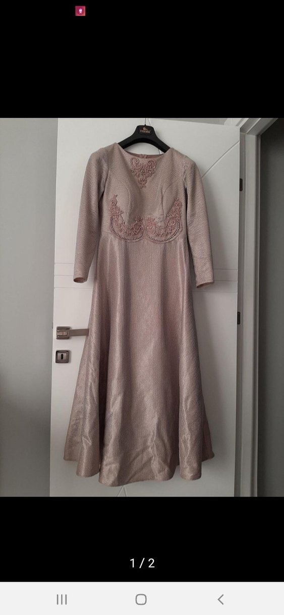 Bej renkli, uzun kollu, salaş kesim vintage tarzda uzun abiye elbise. Göğüs kısmında zarif işlemeler ve tekne yaka detayı bulunur.