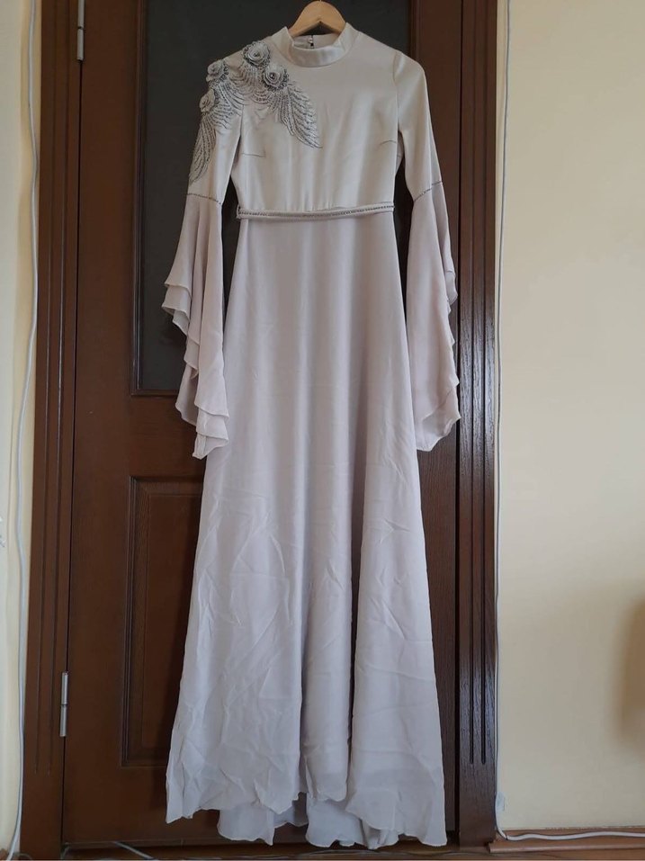 Bej renkli, yüksek yakalı, uzun kollu 38 beden abiye