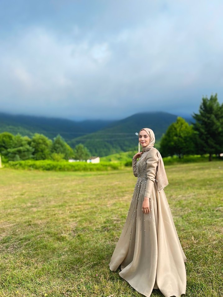 Bej renkli, yüksek yakalı ve uzun kollu kadın abiyesi. Drapeli tasarıma sahip, sade ve mütevazı kesimiyle düğünler için uygun.