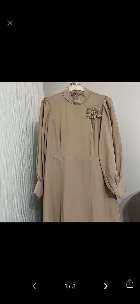 Bej Uzun Kollu Yüksek Yakalı Kadın Elbise