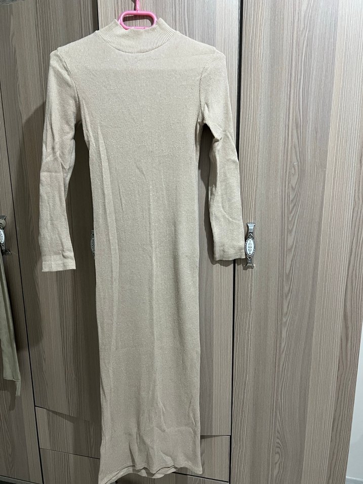 Bej renkte, uzun kollu ve yüksek yakalı bu elbise, vücuda oturan kesimiyle sade ve şık bir görünüm sunar. Günlük kullanım için uygundur.
