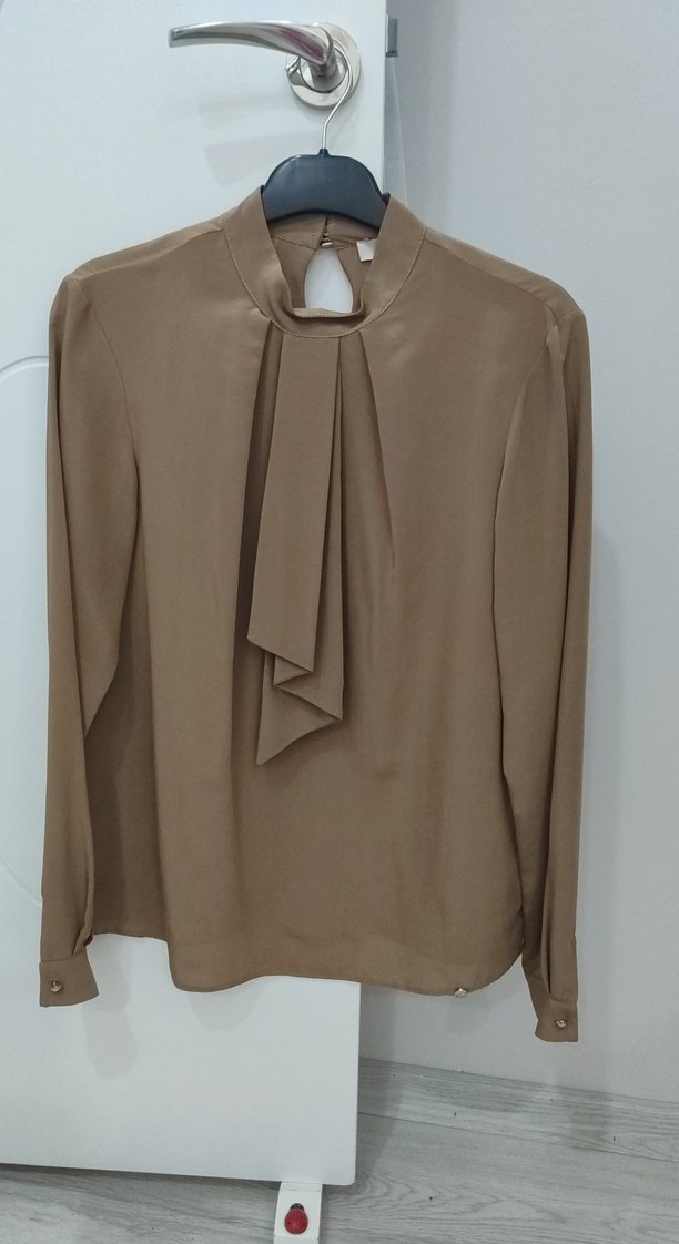 Bej renkli, uzun kollu ve yüksek yakalı kadın gömleği. İpek gibi dokusuyla drapeli, normal kesim, ofis için uygun çağdaş tarzda tasarlanmıştır.