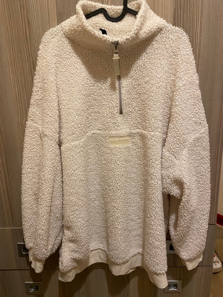 Bej renkte, uzun kollu, yüksek yakalı ve kürk detaylı kadına özel sweatshirt. Rahat kesimli ve önünde fermuar detayı bulunur.