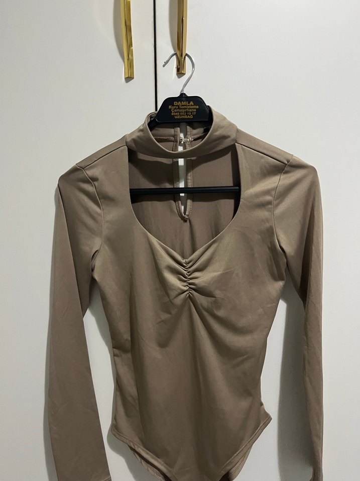 Bej renkli, uzun kollu ve yüksek yakalı, kemerli kısa kesim bluz. Sentetik kumaştan, günlük sokak stiline uygun.