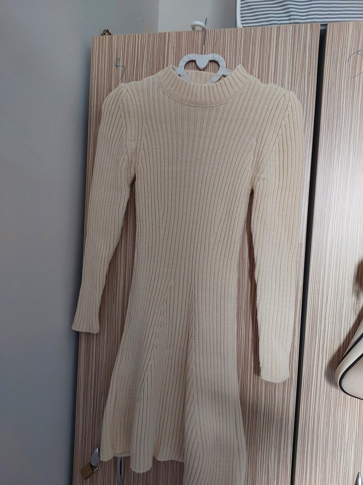 Bu bej renkli, uzun kollu ve yüksek yakalı triko elbise, yumuşak örgü kumaştan olup, vücuda oturan kesime sahiptir. Uzun boyu ve sade tasarımıyla rahat ve şık bir görünüm sunar.