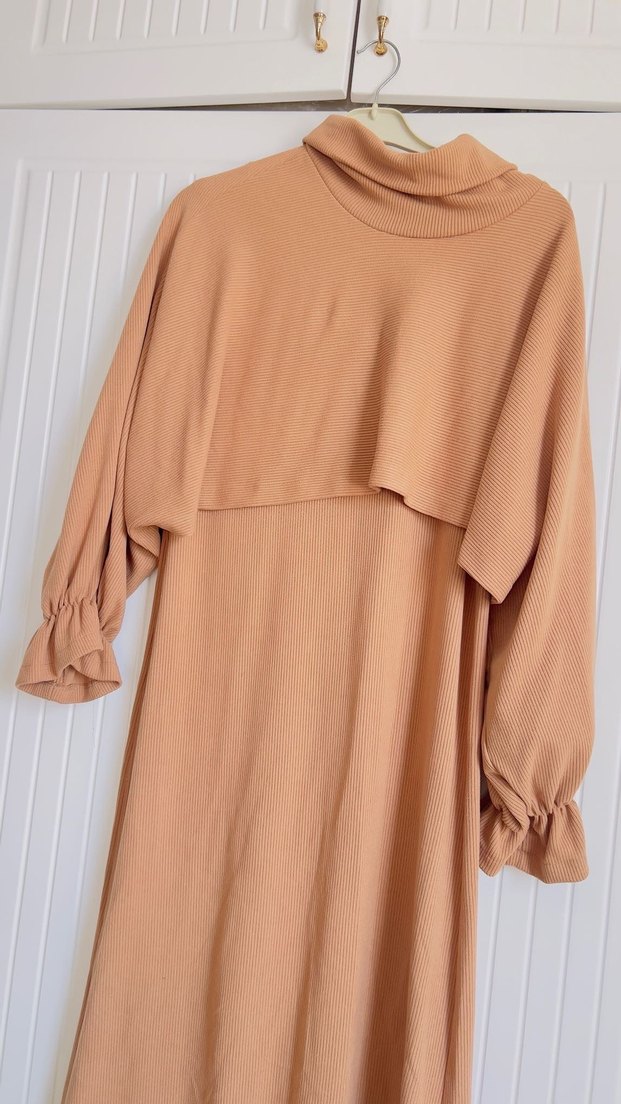 Bej renkli, yüksek yakalı ve uzun kollu triko elbise. Rahat kesimi ve dökümlü tasarımıyla günlük kullanıma uygundur.
