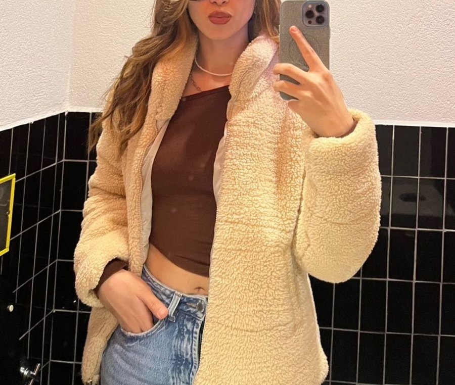 Yumuşak kürk detaylı, uzun kollu, yüksek yakalı, bol kesim bej ceket. Midi boy ve rahat sokak stili, günlük kullanım için uygundur.
