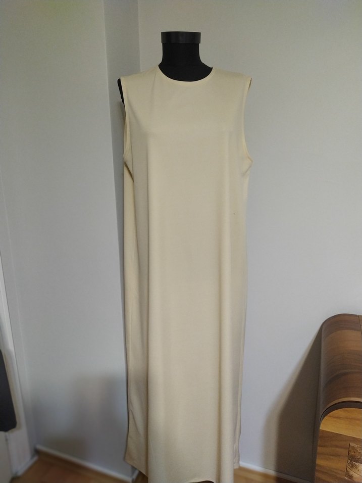 Kolsuz, yuvarlak yaka uzun elbise. Düz bej renk ve rahat kesim, sade ve minimal bir görünüm sunar. Günlük kullanım için uygundur.