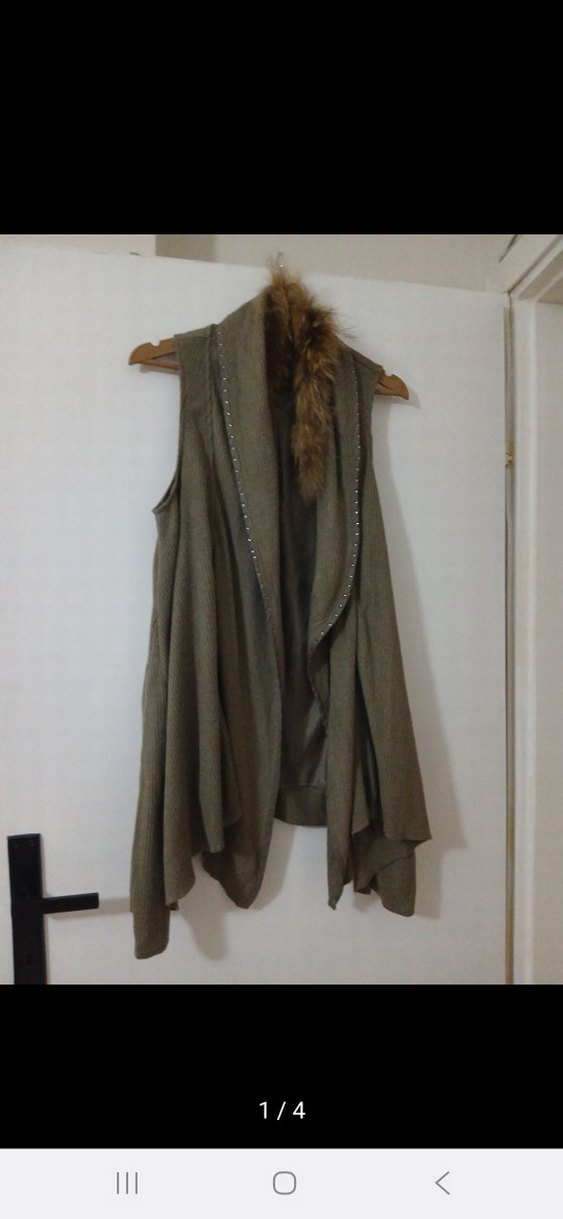 Bej renkte, kolsuz ve uzun kesime sahip keten kumaştan yapılmış salaş yelek. Drapeli yapısı ve straplez yakasıyla rahat ve bohem bir tarz sunar.