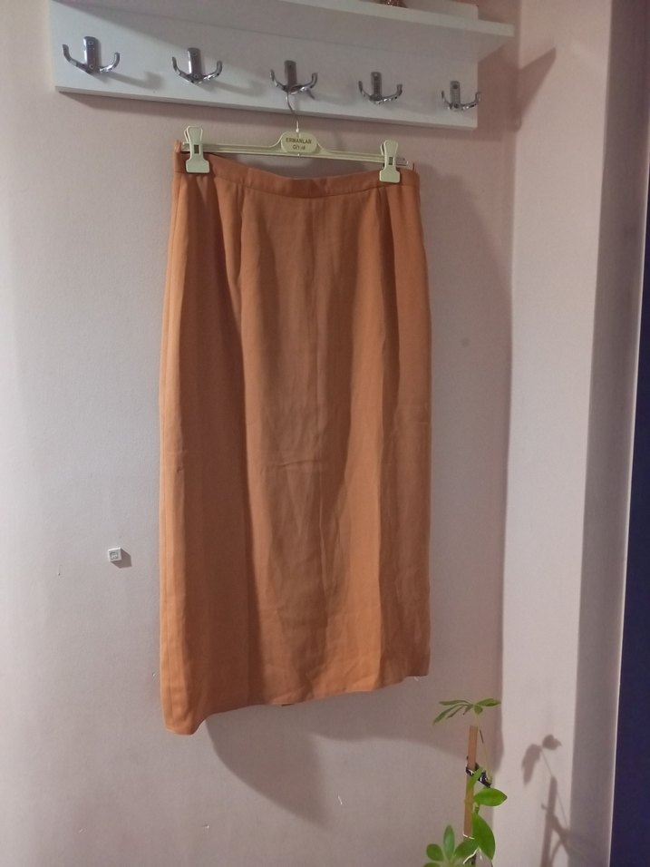 özel dikim krep kumaştan, drapeli uzun etek. Düzenli kesim, minimalist ve desensiz tasarım, ofis için uygun.