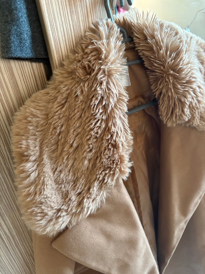 Bej renkli, uzun kesim ve kürk detaylı kadın mont. Sentetik kumaştan, klasik ve modern tarzda, günlük kullanıma uygun rahat bir modeldir. Kol detayları askılıdır.