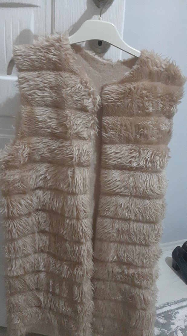 Bej renk, uzun kesim, kolsuz ve kürklü detaylı kadın yelek. Yumuşak sentetik kumaştan, straplez ve vücuda oturan kesimde, bohem tarzda.