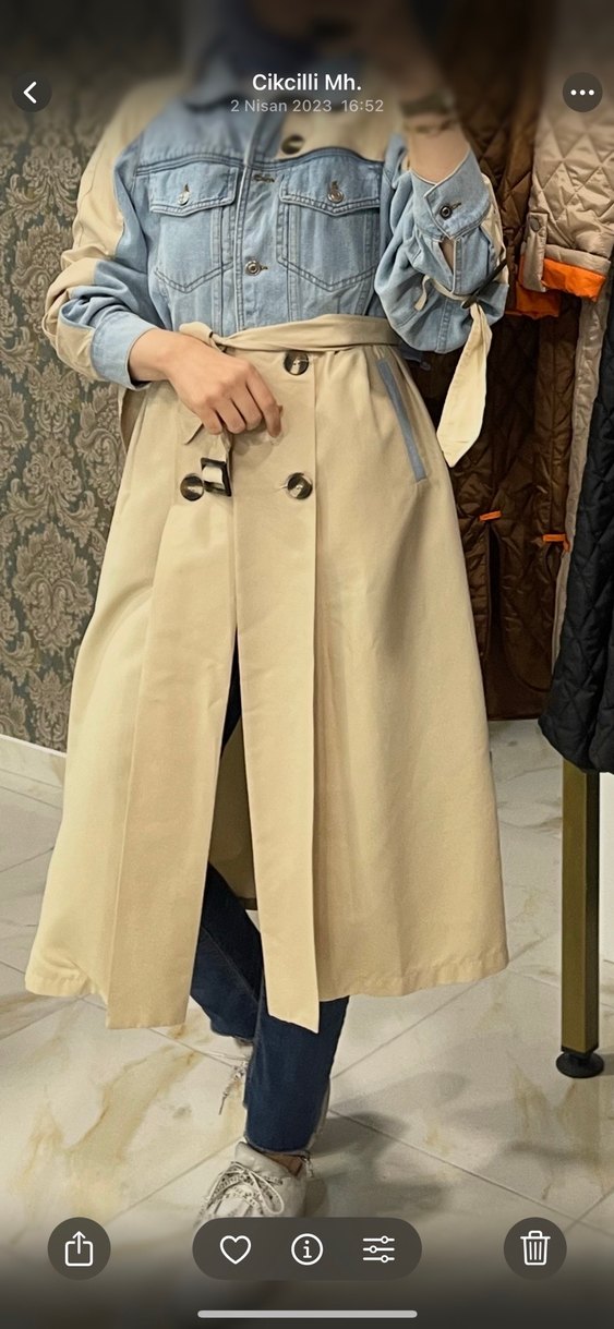 Bej renkli uzun trençkot, kuşaklı ve kesik yakalıdır. Sentetik kumaştan üretilmiş, günlük rahat kullanıma uygundur.