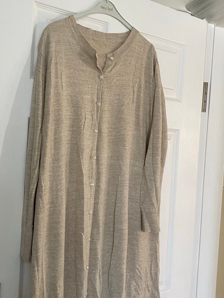 Kadınlar için uzun, bej hırka, bol kesim ve düğmeli ön detaylıdır. Uzun kollu ve yuvarlak yakalı, rahat ve şık bir görünüm sunar. Etiketi yoktur iki kol arasi 60 santim boyu126 santim ona göre alım yapınız .