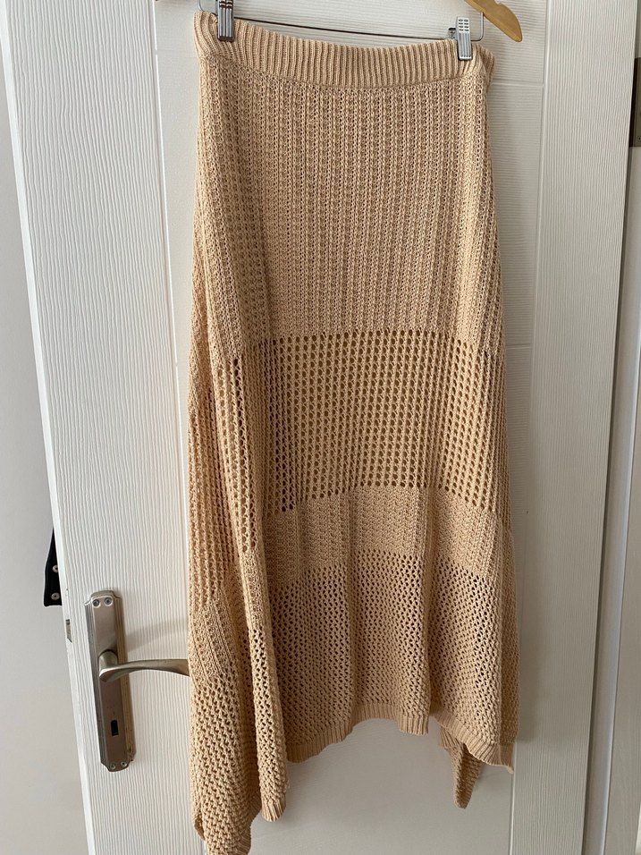 Bej renkte, uzun örgü kadın eteği.Bohem tarzda, günlük kullanım için uygundur. Yenidir. Hiç giyilmedi. Astarlıdır. Astarın boyunu, eteğin belden ve boydan ölçülerini fotoğraflarda belirttim. M ve L bedenler için uygundur.