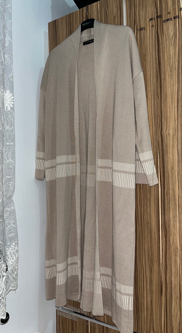 Bej renkte, örgü dokulu, uzun kollu ve notluk yakalı uzun kadın hırkasıdır. Düzenli kesim ve kol ile etek uçlarında ince çizgili desene sahiptir.