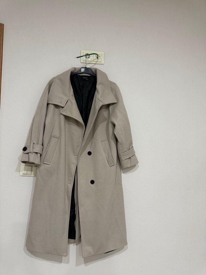 Bej uzun kadın kaban, notched lapel yakalı ve bol kesimdir. Yumuşak ve sıcak dokulu kumaştan üretilmiş, uzun kolludur ve desensizdir. Günlük kullanım için minimalist tarzda uygundur. L XL bedene uygundur